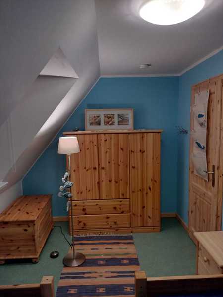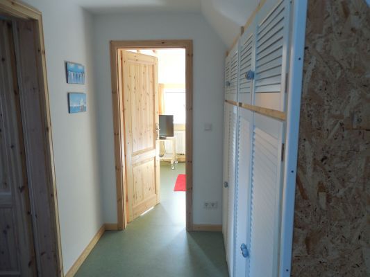 Hier gibt es zwei Schränke, um Kleidung aufzuhängen, und mehrere Kommoden, in denen Handtücher und Laken zu finden sind. Die Treppe kann mit einem Gitter gesichert werden.