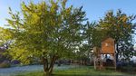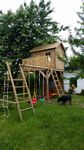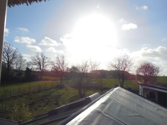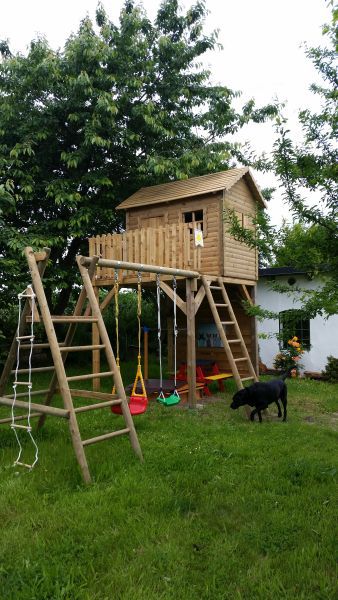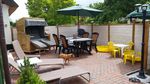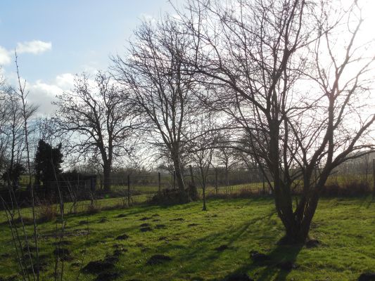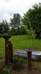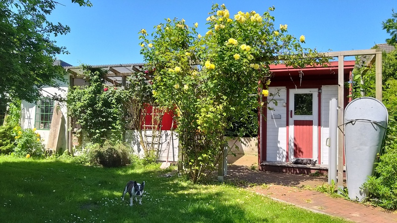 Der Garten ist etwa 1200 qm groß und voll eingezäunt (Zaunhöhe: 1,40 m). Er grenzt im Süden und Westen an eine große Weidefläche. Eine überdachte Terrasse mit Sauna, ein Geräteschuppen und eine Terrasse mit Sitzmöbeln, Elektrogrill und Sichtschutz sind vorhanden.